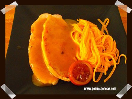 Hoy os traigo una receta sencilla, con sabor y diferente. El pavo siempre ha tenido el problema de que a veces queda seco, con esta salsa no os pasara, queda muy jugoso y el sabor cítrico casa perfectamente con la carne de ave. Lo he acompañado con una pasta “a la naranja” que potencia aún más los sabores pero, si no la encontráis, podéis poner un poco de arroz basmati o pasta normal, también quedará delicioso.