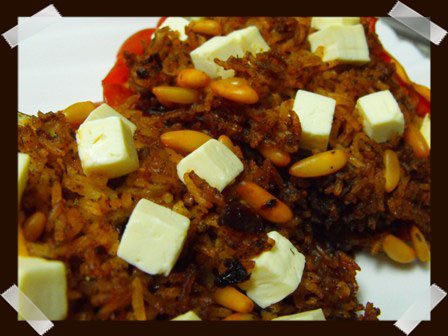 arroz basmati, cebolla, eneldo, horno, piñones, primeros platos, queso feta, recetas, recetas con arroz, recetas con pimiento, recetas de Oriente Medio, recetas vegetarianas