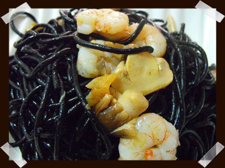 gambas, primeros platos, recetas, recetas con pasta, recetas con setas, setas, spaguetti nero di sepia